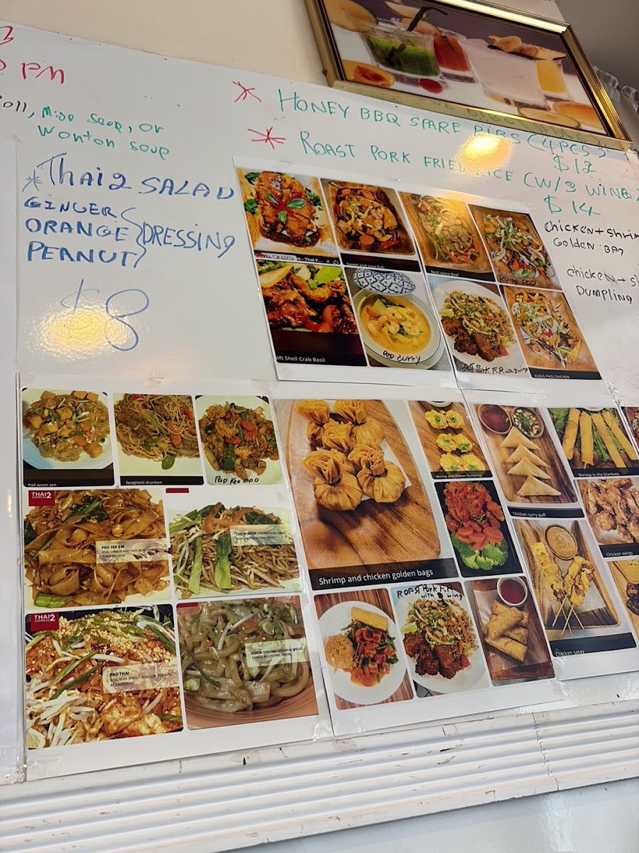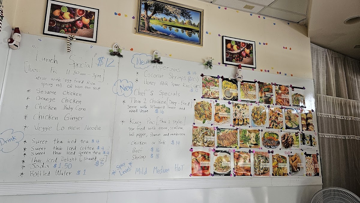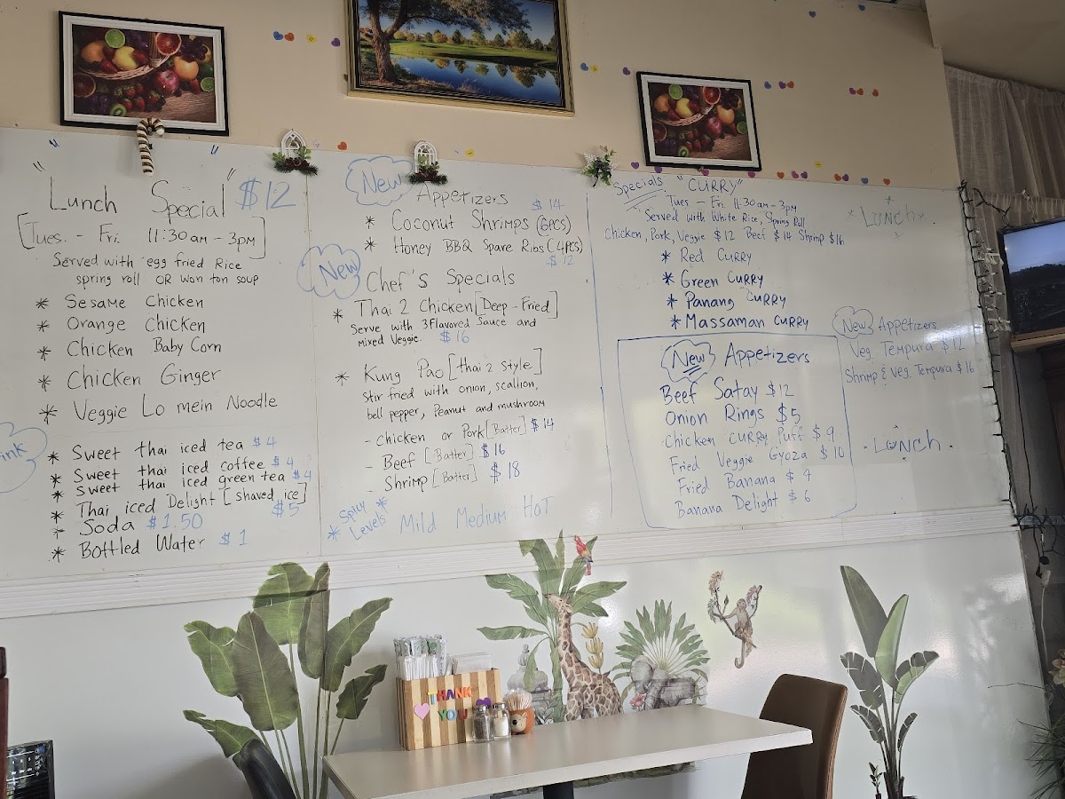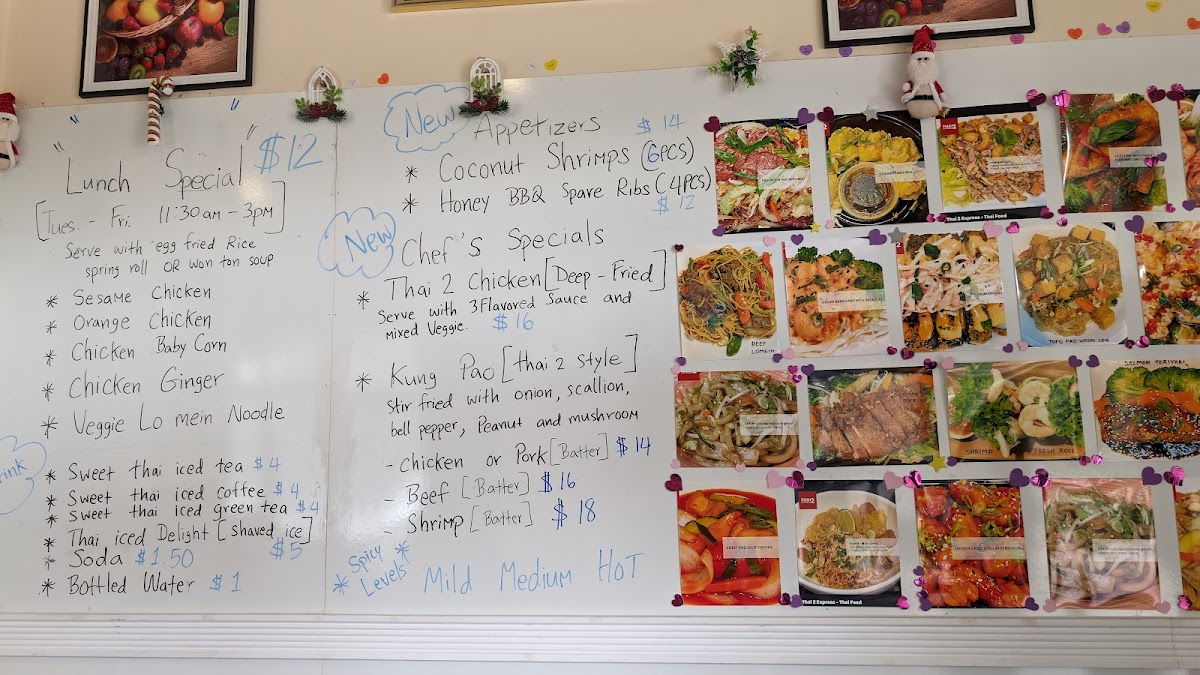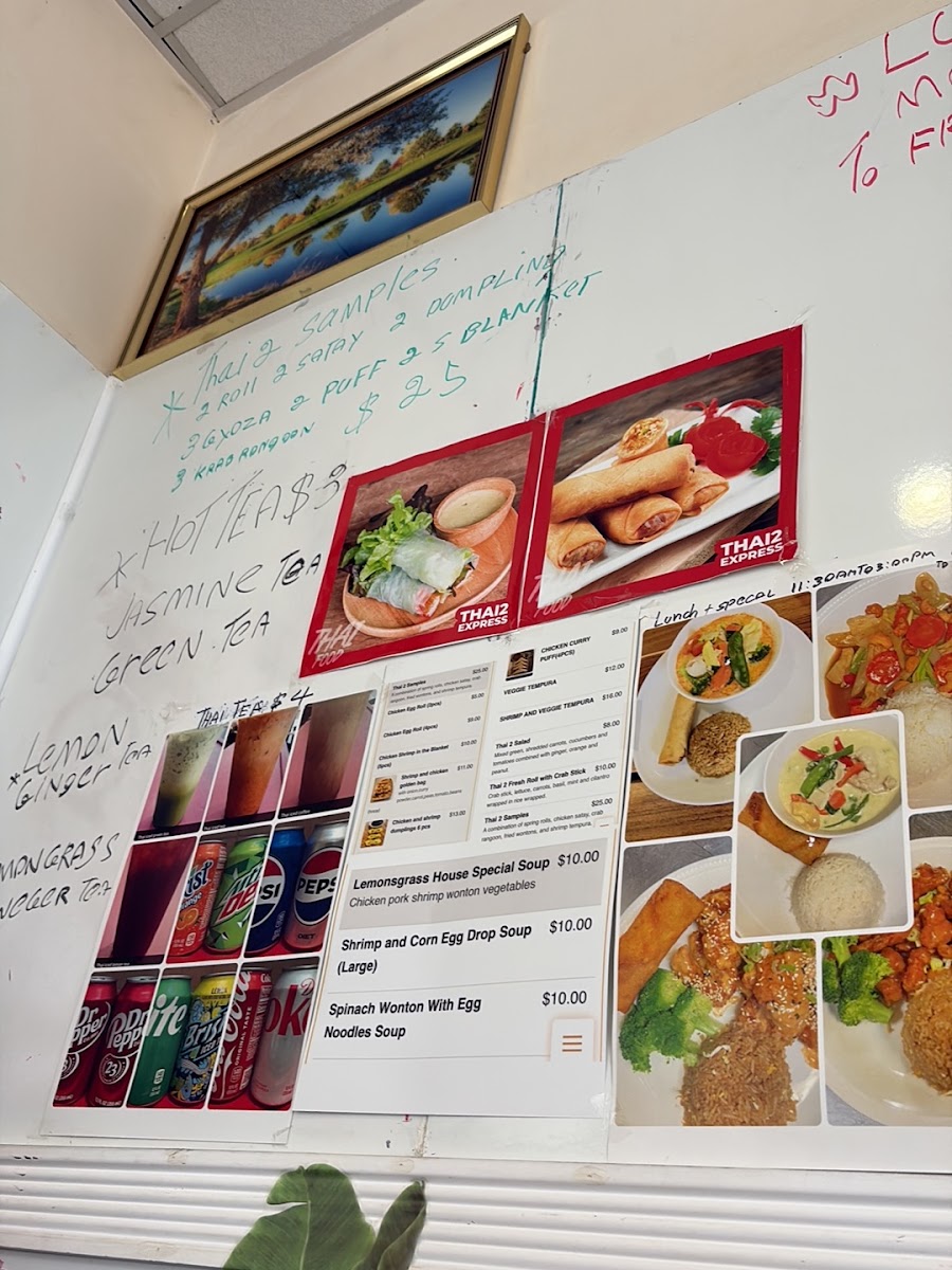 From a reviewer's perspective, the menu at Thai 2 Express offers a diverse array of Thai and Asian-inspired dishes that cater to both sushi lovers and fans of classic curries and noodles. The sushi selection includes flavorful options like the Jb Tempura Roll, Boynton Roll, Lantana Roll, Shrimp Tempura Roll, and Tae Kwon Do Roll, providing a fresh and creative start to any meal. Curry enthusiasts can choose from Red Curry, Massaman Curry, Panang Curry, and Green Curry, while fried rice options like Pineapple Fried Rice Pork, Pineapple Fried Rice Duck, Roast Pork Fried Rice W/Ch Wings (3pcs), Pork Fried Rice, and Beef Fried Rice offer hearty comfort. Soups range from small portions like Egg Drop Soup (Small) to larger servings such as Egg Drop Soup (Large), Chicken Noodle Soup (Large), and Spinach Wonton With Egg Noodles Soup, perfect for warming up on cooler days. Appetizers like Coconut Shrimp Tempura (6pcs), Steamed Chicken Gyoza (7pcs), Vegetable Spring Rolls (2pcs), Papaya Salad, and Fried Chicken Dumplings (6pcs) make great starters. Noodle dishes such as Chow Mein, Lo Mein, Pad See Ew, Pad Woon Sen, and Crispy Duck Pad Thai showcase the restaurant’s ability to balance flavors and textures. Steamed items like Steamed Chicken With Mixed Vegetable and Steamed Tofu With Mixed Vegetable, alongside bowls of Pork Noodle, Bamee Moo Dang, Beef Noodle, and Duck Noodle, offer lighter, wholesome options. Chef’s specials like Kung Pao Pork (Thai 2 Style), Kung Pao Chicken (Thai 2 Style), Ginger Mushroom Soft Shell Crab Basil, and Chicken Chili Paste demonstrate inventive takes on traditional dishes. Entrees such as Sweet And Sour Chicken (E8), Shrimp And Chicken White Sauce (E13), Shrimp Snow Peas (E12), Chicken Cashew (E2), and Chicken Broccoli (E5) provide satisfying main courses, complemented by party trays and sides including Egg Fried Rice, Steamed Lomein, and Steamed Vegetables for family-style dining. Drinks like Thai Iced Green Tea, Pepsi, Canada Dry, Dr. Pepper, and Sunkist Orange round out the menu, making Thai 2 Express a versatile spot that delivers both variety and authenticity in a casual, approachable setting.