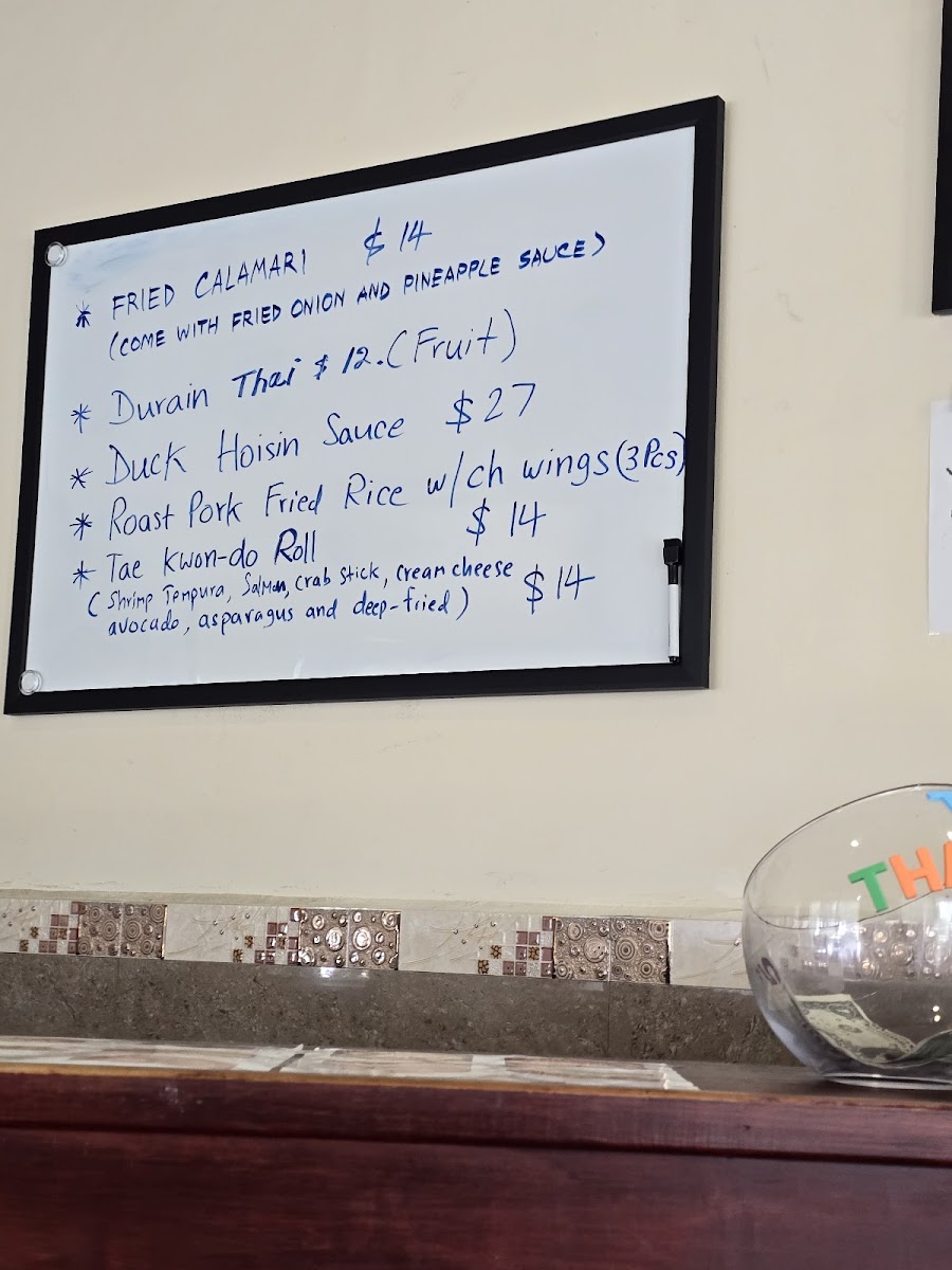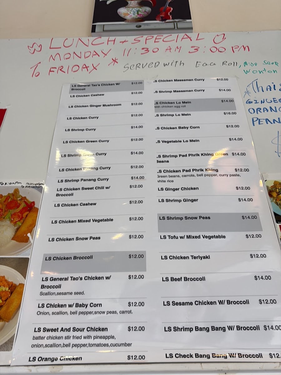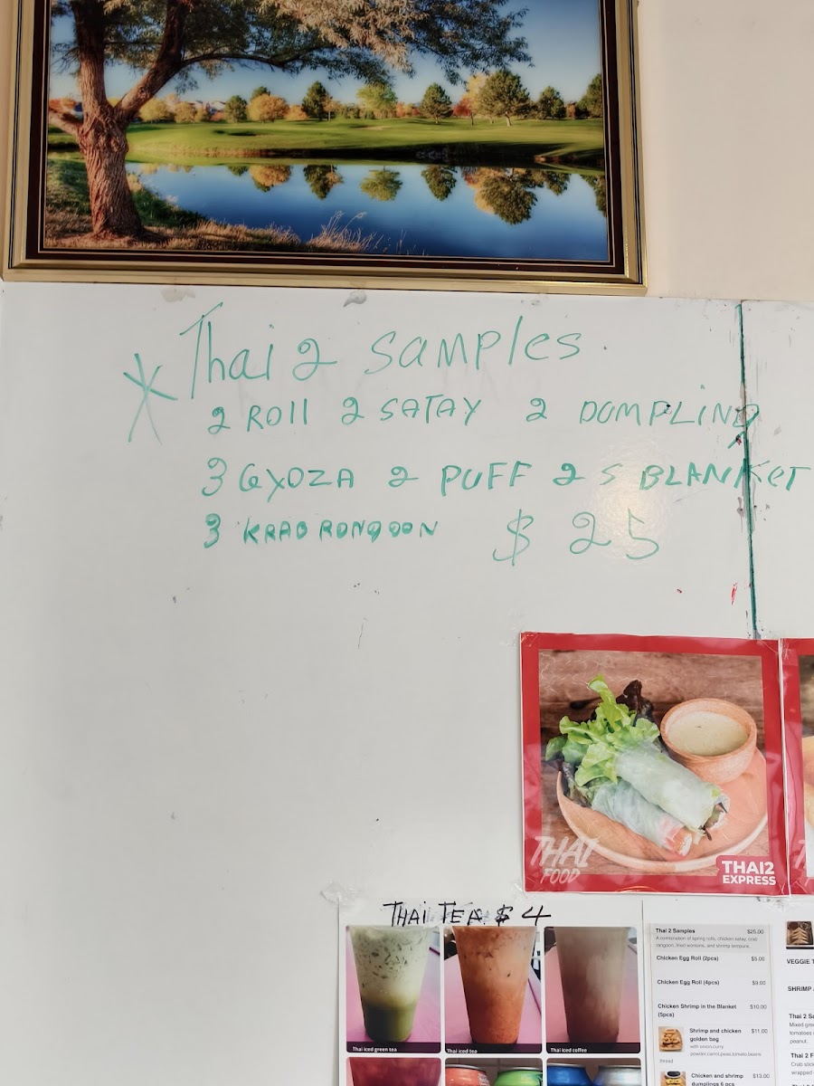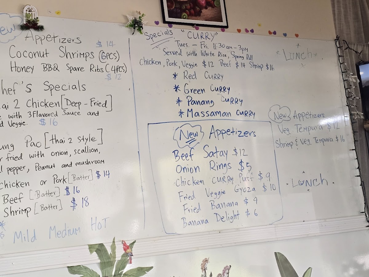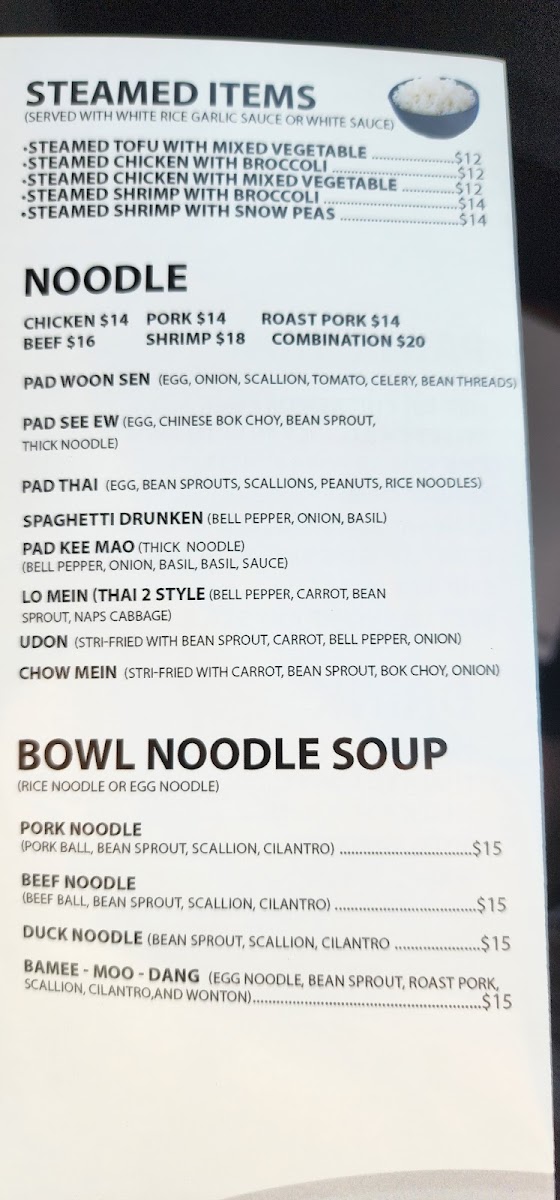 From a reviewer's perspective, the menu at Thai 2 Express offers a diverse array of Thai and Asian-inspired dishes that cater to both sushi lovers and fans of classic curries and noodles. The sushi selection includes flavorful options like the Jb Tempura Roll, Boynton Roll, Lantana Roll, Shrimp Tempura Roll, and Tae Kwon Do Roll, providing a fresh and creative start to any meal. Curry enthusiasts can choose from Red Curry, Massaman Curry, Panang Curry, and Green Curry, while fried rice options like Pineapple Fried Rice Pork, Pineapple Fried Rice Duck, Roast Pork Fried Rice W/Ch Wings (3pcs), Pork Fried Rice, and Beef Fried Rice offer hearty comfort. Soups range from small portions like Egg Drop Soup (Small) to larger servings such as Egg Drop Soup (Large), Chicken Noodle Soup (Large), and Spinach Wonton With Egg Noodles Soup, perfect for warming up on cooler days. Appetizers like Coconut Shrimp Tempura (6pcs), Steamed Chicken Gyoza (7pcs), Vegetable Spring Rolls (2pcs), Papaya Salad, and Fried Chicken Dumplings (6pcs) make great starters. Noodle dishes such as Chow Mein, Lo Mein, Pad See Ew, Pad Woon Sen, and Crispy Duck Pad Thai showcase the restaurant’s ability to balance flavors and textures. Steamed items like Steamed Chicken With Mixed Vegetable and Steamed Tofu With Mixed Vegetable, alongside bowls of Pork Noodle, Bamee Moo Dang, Beef Noodle, and Duck Noodle, offer lighter, wholesome options. Chef’s specials like Kung Pao Pork (Thai 2 Style), Kung Pao Chicken (Thai 2 Style), Ginger Mushroom Soft Shell Crab Basil, and Chicken Chili Paste demonstrate inventive takes on traditional dishes. Entrees such as Sweet And Sour Chicken (E8), Shrimp And Chicken White Sauce (E13), Shrimp Snow Peas (E12), Chicken Cashew (E2), and Chicken Broccoli (E5) provide satisfying main courses, complemented by party trays and sides including Egg Fried Rice, Steamed Lomein, and Steamed Vegetables for family-style dining. Drinks like Thai Iced Green Tea, Pepsi, Canada Dry, Dr. Pepper, and Sunkist Orange round out the menu, making Thai 2 Express a versatile spot that delivers both variety and authenticity in a casual, approachable setting.